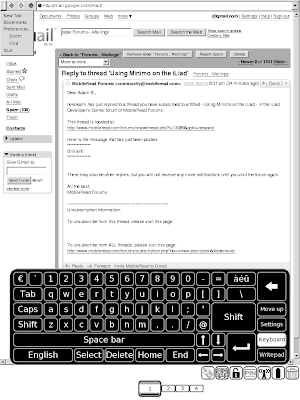 It seems that compiling Minimo for the iLiad wasn’t necessary. In early firmware versions, you could use the standard Minimo installation to browse the web. Although, you didn’t have your own address bar or navigation buttons. Further on, iRex patched their code to prevent this. I was digging around in the firmware today when I found the launch mozilla script. After setting Minimo to use the modified libX11 and replacing the included chrome templates with that of another Minimo release, I was able to get a working web browser.